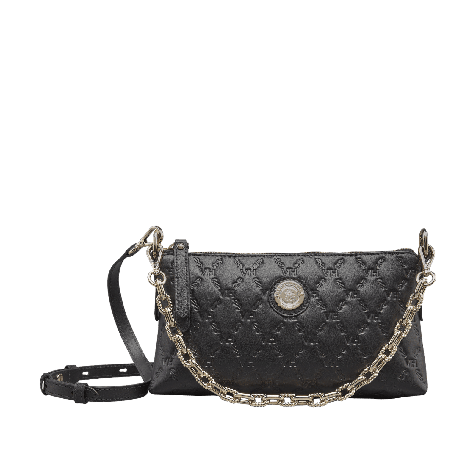 Combinação de elegância e a versatilidade juntas, a Bolsa Ada Catena Shoulder Elos VH pode ser usada com dupla função: alça de corrente dourada removível ou com alça em Couro, que confere à bolsa, o estilo casual. Possui espaço interno adaptado para smartphone. A Coleção ELOS VH é uma releitura da Clássica estampa da marca nos anos 80. Artesãos realizam com maestria o trabalho da prensa no Couro de altíssima qualidade. Realçando o DNA e herança da VICTOR HUGO.