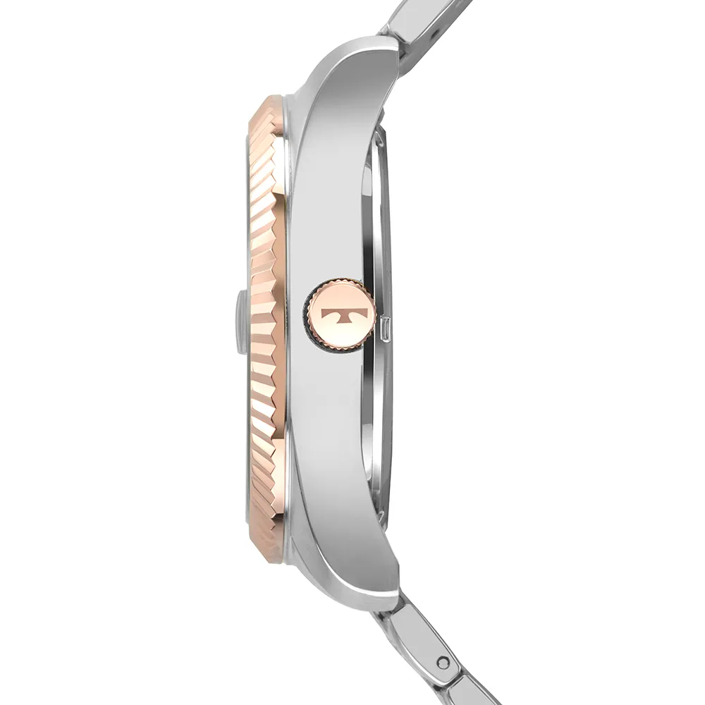 A linha Riviera segue enaltecendo a essência dos clássicos. O novo modelo feminino apresenta aro externo trabalhado com o icônico acabamento corrugado e vidro com lupa de calendário, ambos elementos tradicionais do universo relojoeiro. Além disso, ele possui mostrador com assinatura de linha e aplicação de pedras em todos os marcadores de hora, além da sofisticada pulseira em 5 links. Produto 100% em aço inoxidável, com máquina quartz japonesa Miyota, calendário e resistência à água de 50 metros